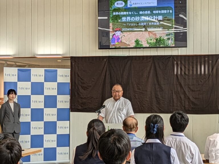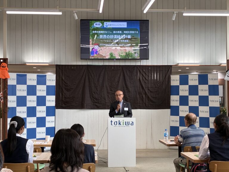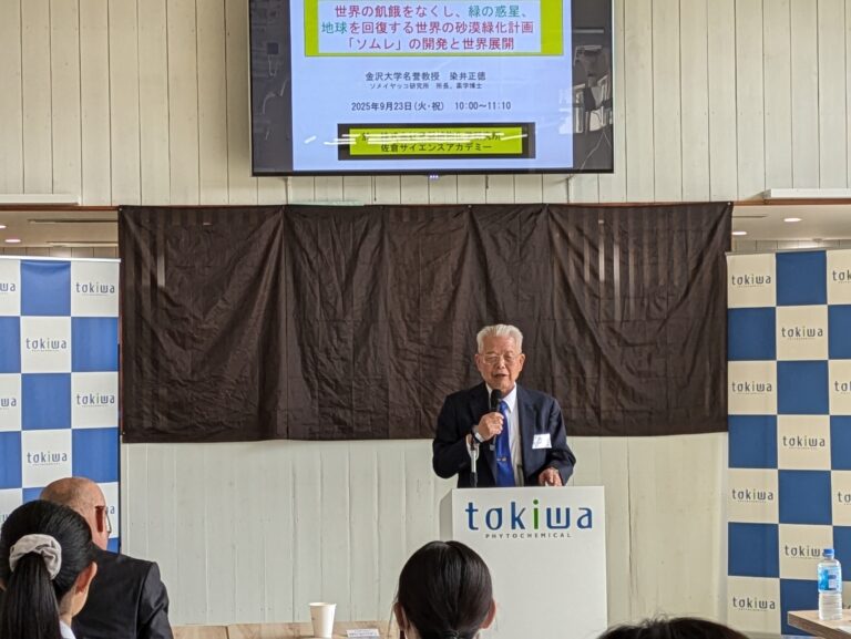 深刻化するこれらの問題を解決するために先生が開発された「ソムレ」という化合物は、植物の成長促進・収穫量増収剤としての効果を示しています。本講演では、先生の長年の夢である「地球の薬」の開発と、砂漠緑化を実現させるための具体的な研究についてお話しいただきました。